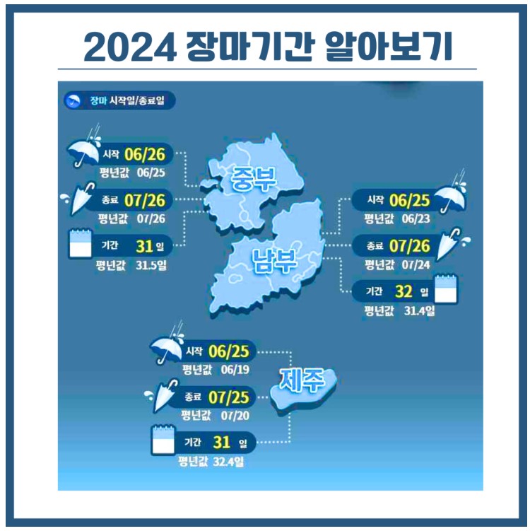 장마는 지역에 따라 조금씩 다르며 중부와 남부, 제주도로 나눌 수 있습니다.